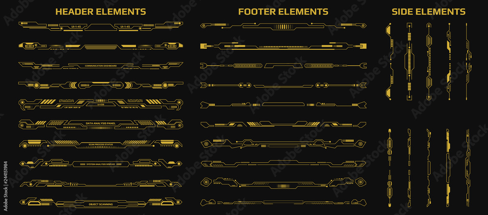 HUD Futuristic Header Footer And Side Elements Set For UI Game Inforgraphic Frame Vector. Gold Abstract Future Cyber Gadget Bar Shape Display Design Illustration. #244151984