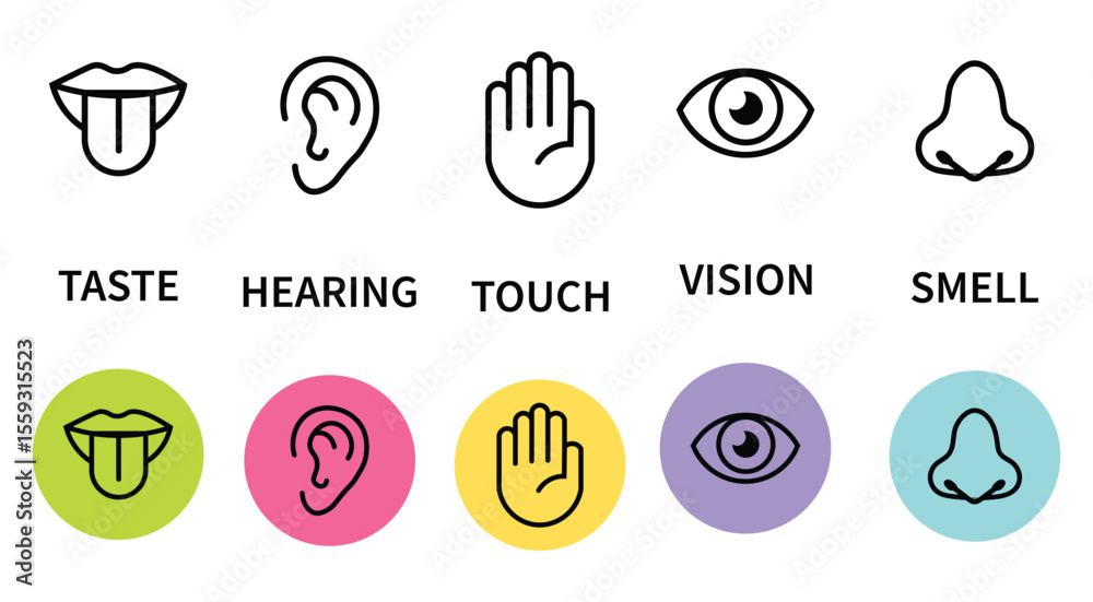 Human senses icon set. Vision eye, smell nose, hearing ear, touch hand, taste mouth with tongue. Simple line icons and black circle. Five senses of human nervous system. Vector illustration. #1559315523