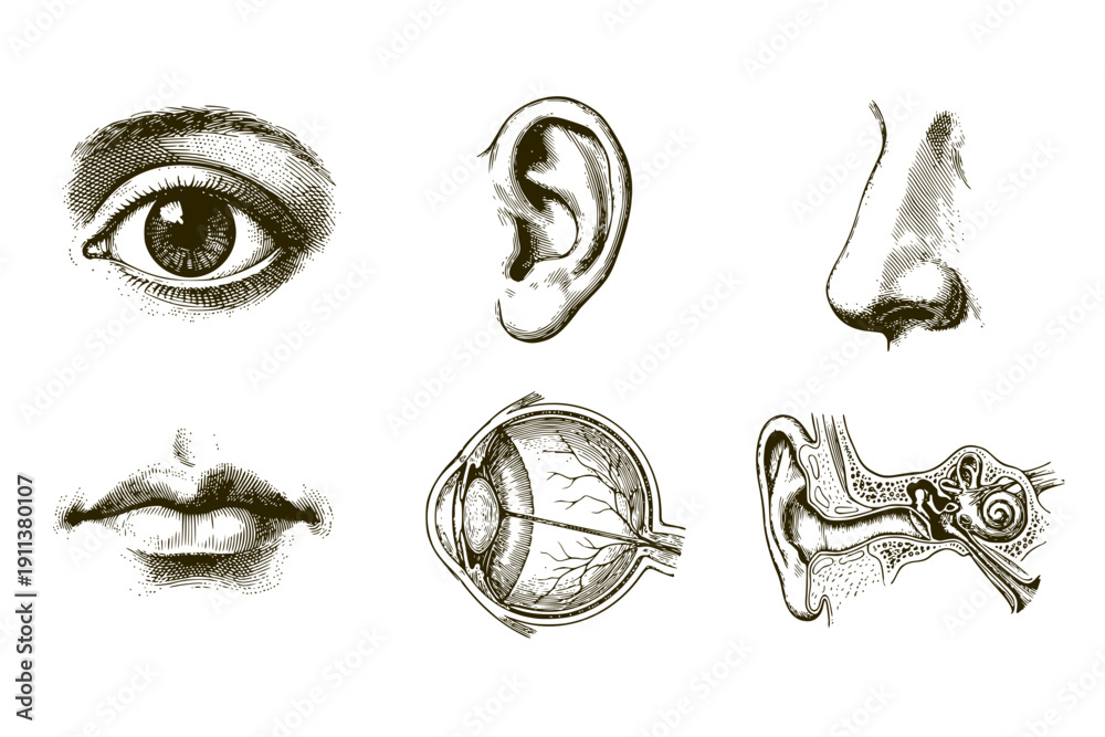 Human Sensory Organs Engraving Set of 6 Black and White Isolated Anatomy Illustrations #1911380107