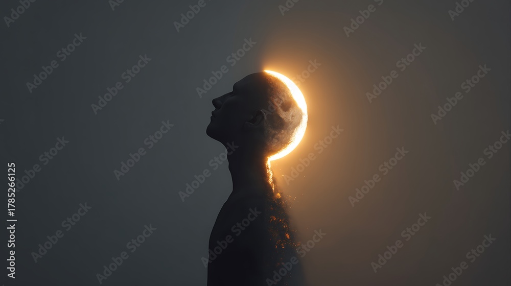 human silhouette with glowing solar flare on one side and moon shadow on the other, conceptual art of emotional balance, surreal realism, v7 fine depth #1785266125