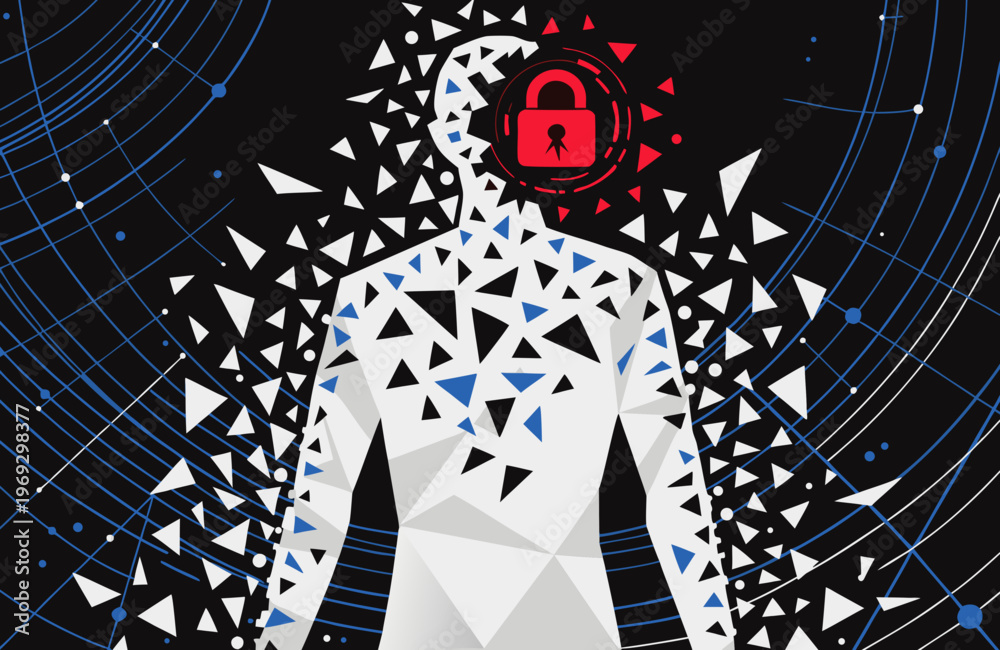 Humanoid form composed of geometric shards and circuits disintegrating with a red digital padlock overlay symbolizing data security concerns and cybersecurity threats. #1969298377