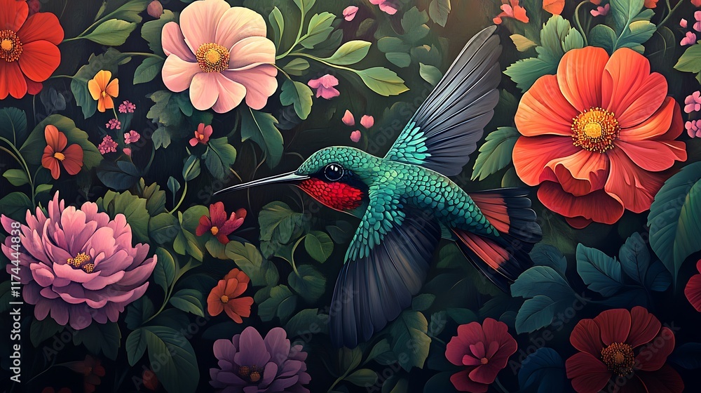 Hummingbird in a Vibrant Floral Paradise: A Masterpiece of Digital Art #1174444838