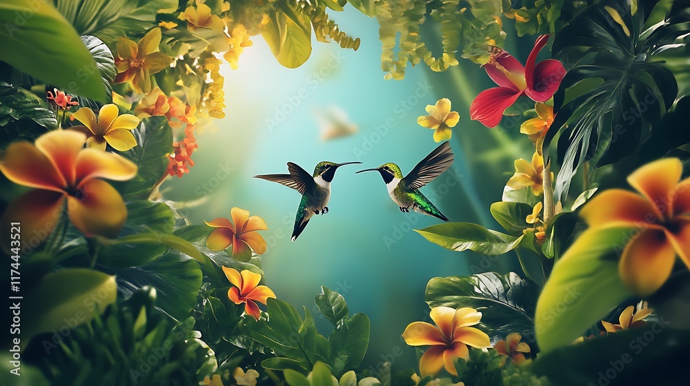 Hummingbirds in Tropical Paradise: A vibrant digital art depicting two hummingbirds amidst lush foliage and blossoms. #1174443521
