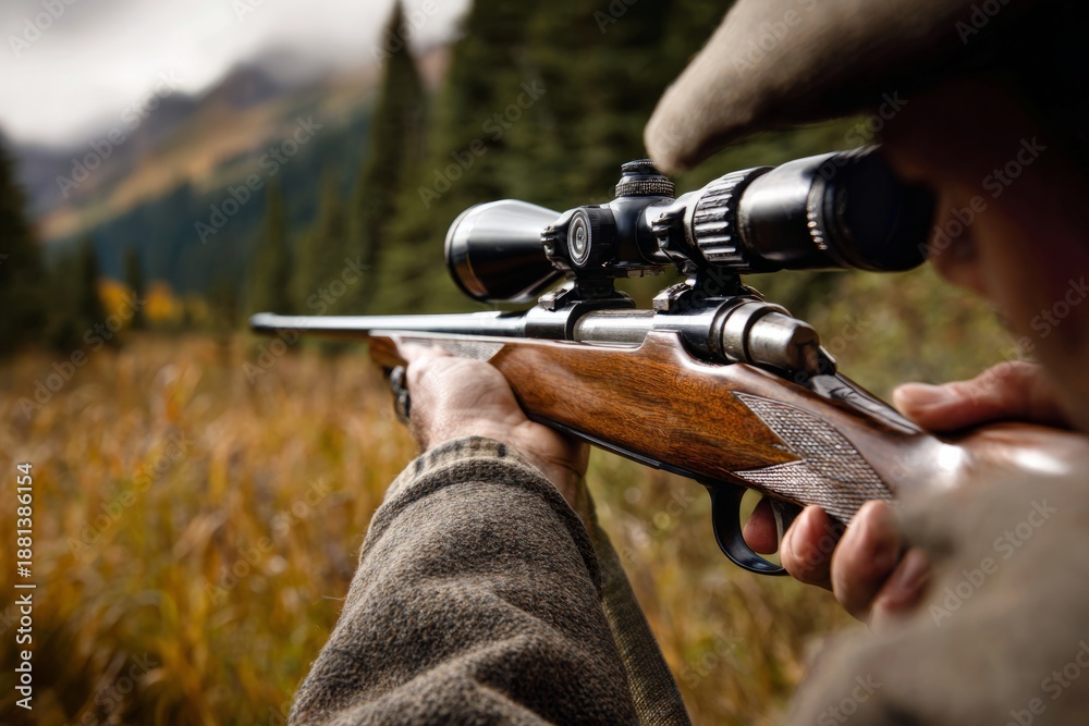 Hunter aiming rifle with scope in wilderness #1881386154