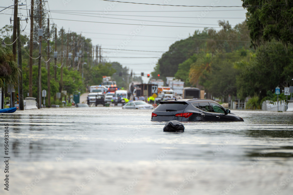 Hurricane Debby flooded city street with trapped cars submerged under water in Florida residential area. Consequences of natural disaster #1954931045