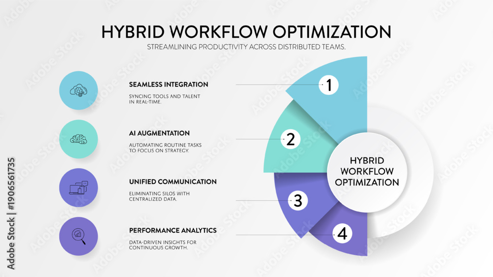 Hybrid Workflow Optimization Infographic Vector Seamless Integration, AI Augmentation, Unified Communication, Performance Analytic Streamlining Distributed Team Productivity Diagram Slide Presentation #1906561735