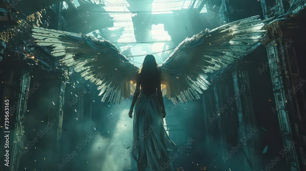 Hyper real photo floating in the air Epic battle between picturesque female angel with huge white wings and angel like demons with black wings in an underground hellscape city #739563165