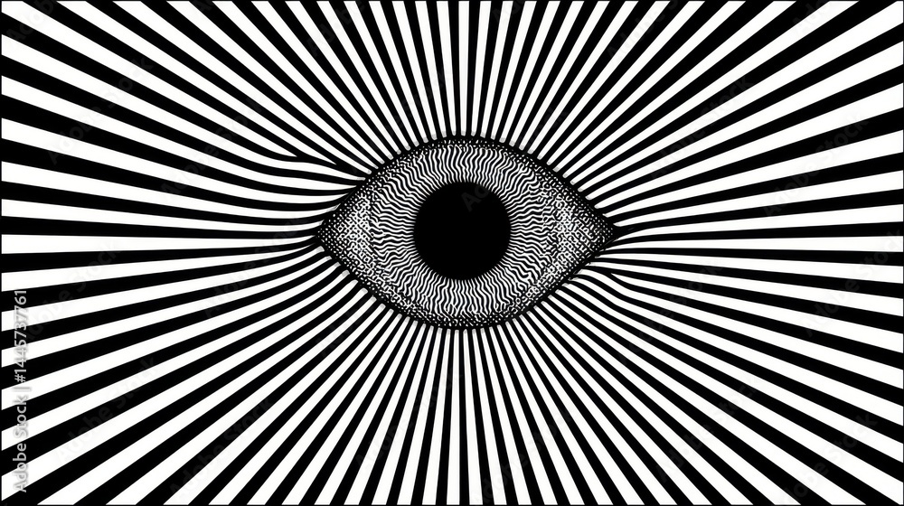 Hypnotic eye with black and white optical illusion lines, psychedelic vision, surreal abstract art, trippy geometric pattern, mind-bending visual effect, modern graphic design. #1445737761