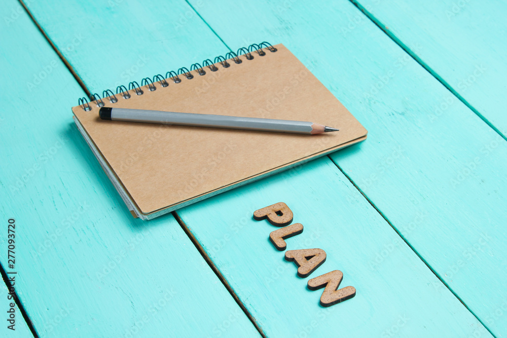 I have an plan! Notebook with craft paper with pencil on blue wooden desk with word PLAN. #277093720