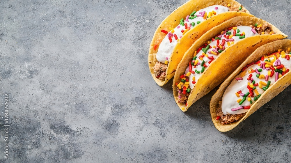 Ice cream taco shells with colorful scoops and fun toppings, summertime desserts, creative food twist #1784775212