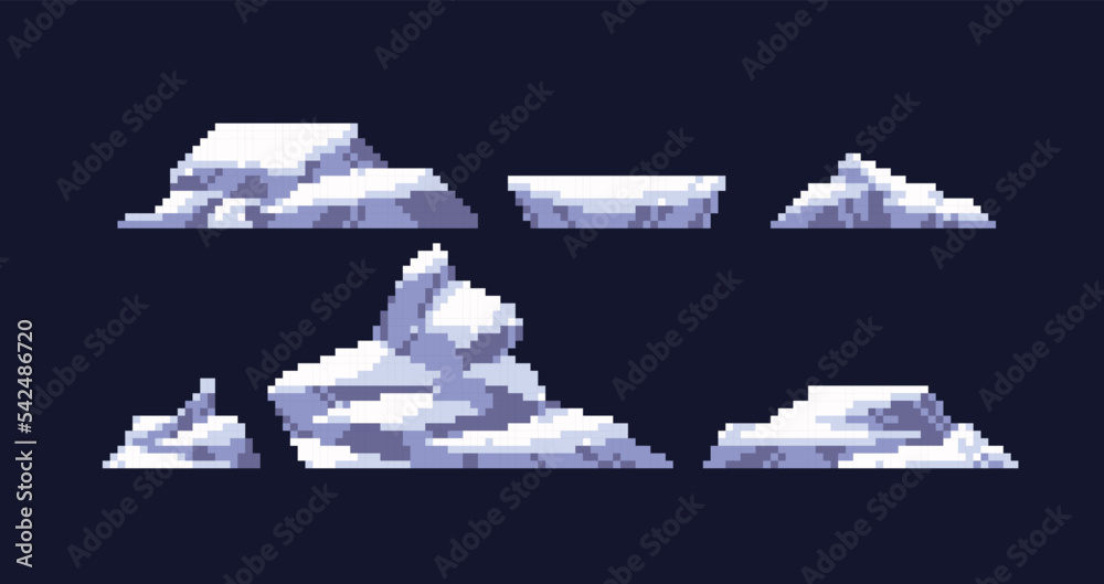 Ice mountain pixel art set. Iceberg, frozen hill collection. Arctic or antarctic rock. 8 bit sprite. Game development, mobile app. Isolated vector illustration. #542486720