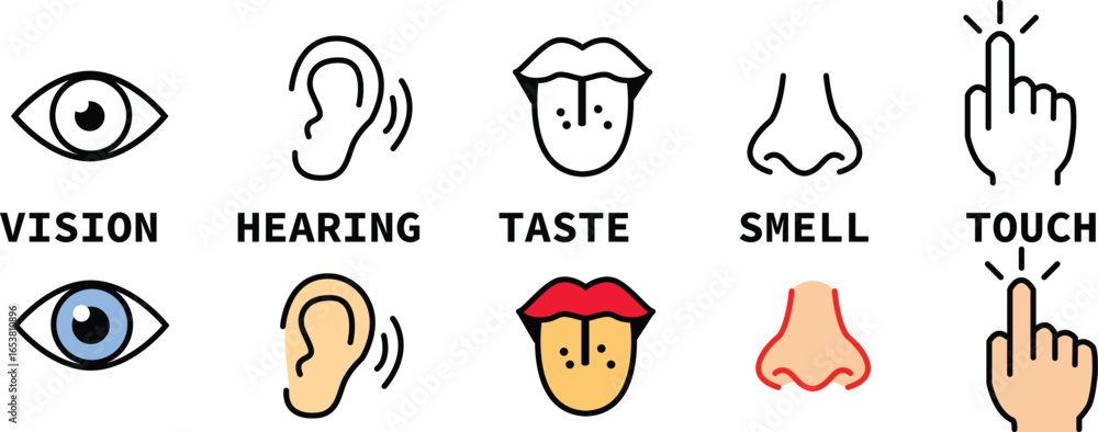 icon set of five human senses. vision eye, smell nose, hearing ear, touch hand, taste mouth with tongue sign. medical reference symbol. five types of human sense logo. flat style. #1653810896