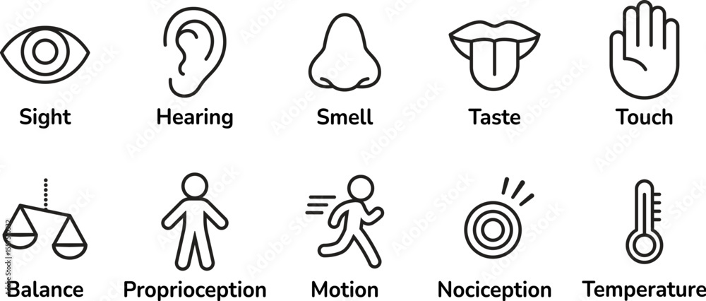 Icon set of human senses of perception. Sight, smell, hearing, touch, taste and sense of balance, temperature, body and pain. Simple, minimal line icons vector illustration. #1557510532
