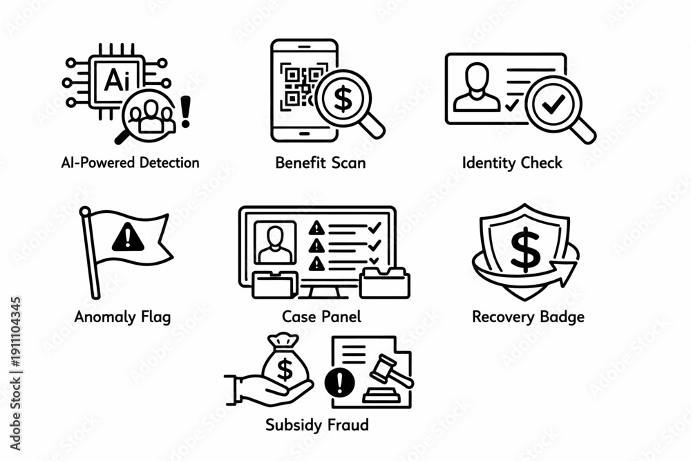 Icons illustrating ai detection and fraud prevention in benefits and identity verification #1911104345