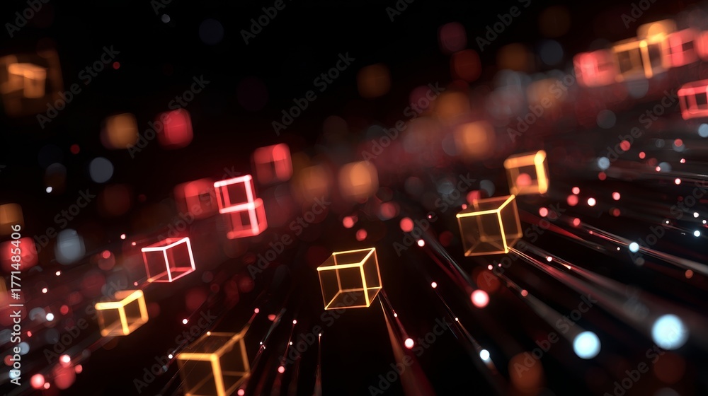 Illuminated data streams intertwined with suspended cubes creating a futuristic atmosphere #1771485406