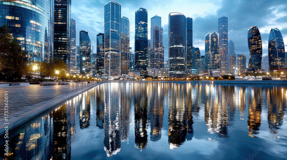 Illuminated skyscrapers reflect in calm water, showcasing vibrant night city skyline #1737360891