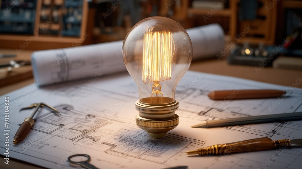 Illuminated Vintage Light Bulb on Blueprint Background with Tools and Creative Setup #1915104320