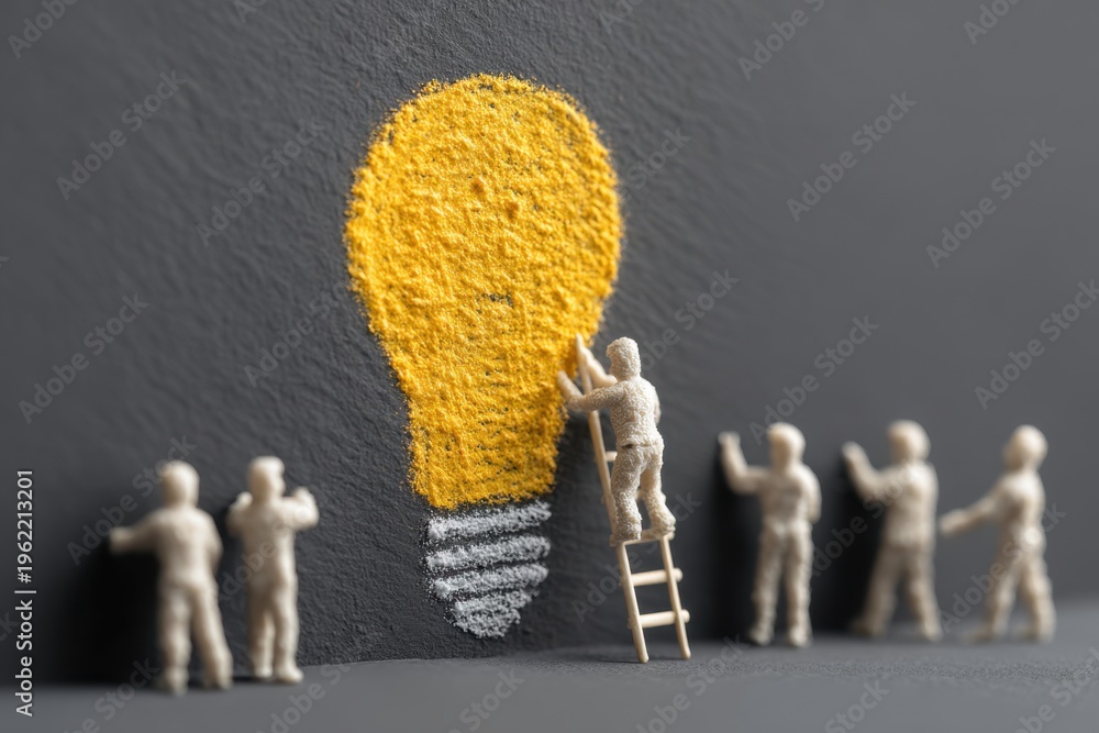 Illuminating Ideas: Miniature figures collaborate to bring a vibrant lightbulb idea to life, symbolizing the collective effort behind innovation and creative thinking. #1962213201