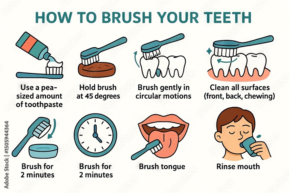 Illustrated guide on how to brush your teeth: step-by-step instructions for effective oral hygiene routine and healthy teeth care. White background #1505944364