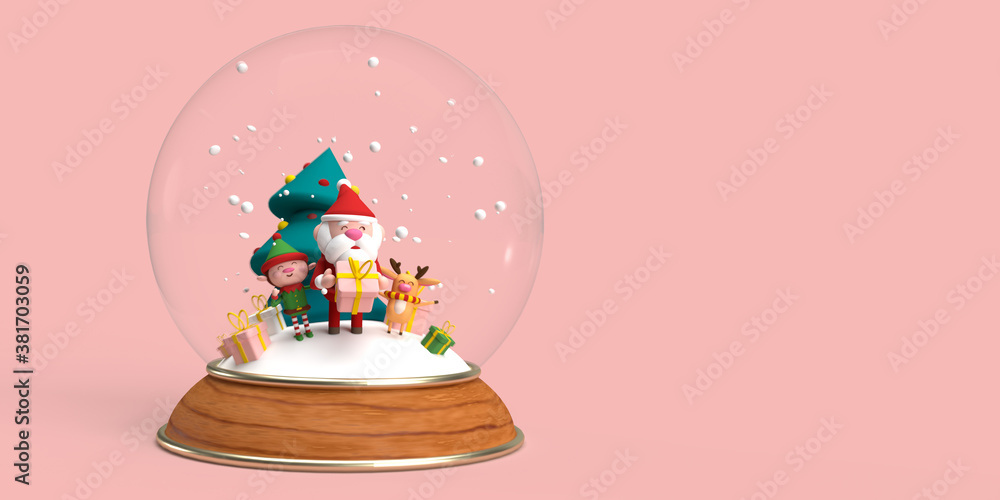 Illustration 3D d'un globe de neige de Noël avec le père Noël, lutin renne et sapin. #381703059