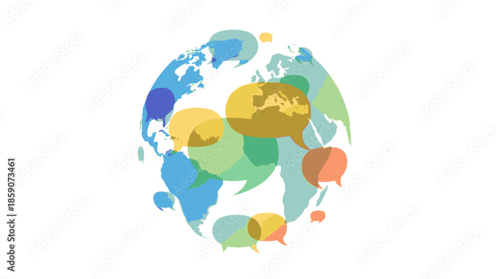 Illustration of a globe with colorful, overlapping speech bubbles on a white background, symbolizing geopolitics and security discussions. #1859073461