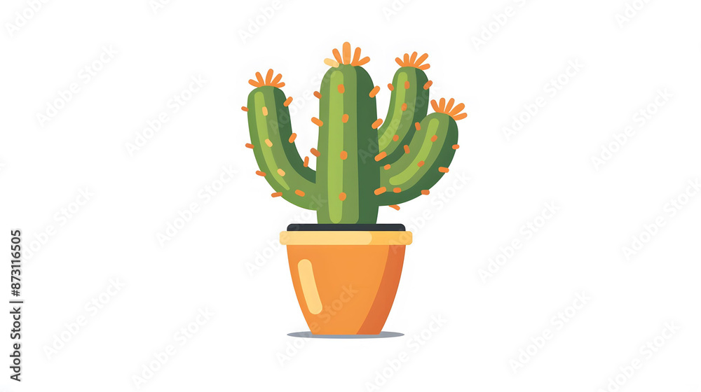 Illustration of a green cactus plant with small flowers in an orange pot, isolated on a white background. Perfect for botanical themes and decor. #873116505