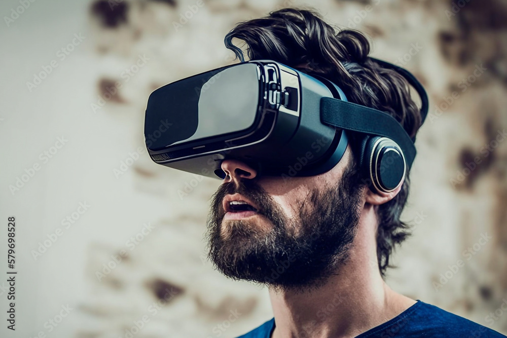 Illustration of a man wearing a VR headset - Ai generative #579698528