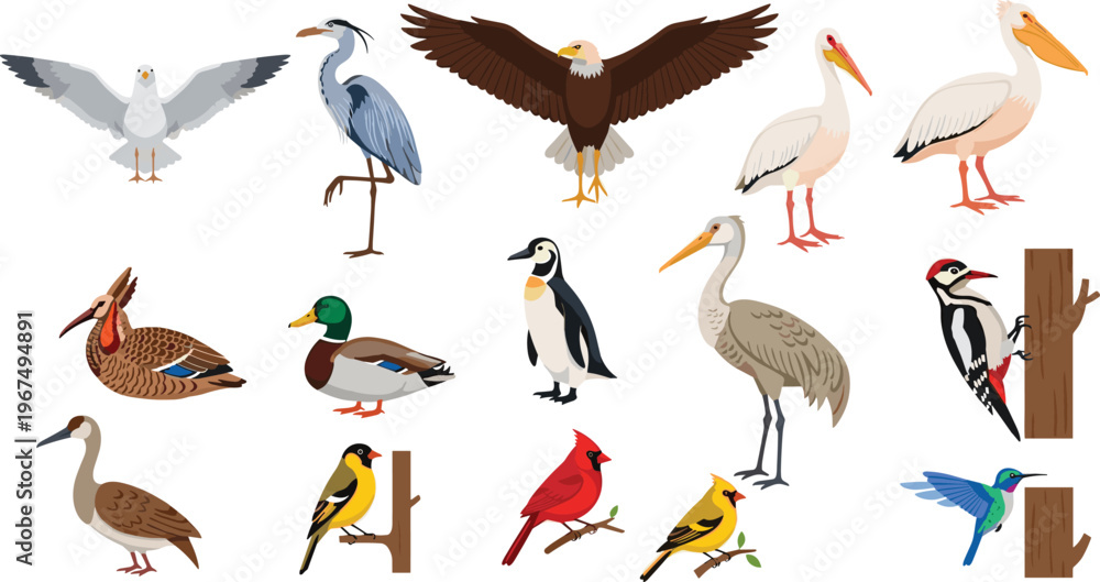 Illustration of Diverse Birds Including Eagle, Heron, Pelican, Duck, Penguin, Woodpecker, Cardinal, Finch, and Hummingbird for Wildlife and Nature Designs #1967494891