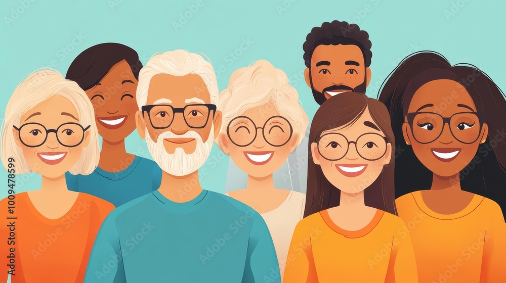 Illustration of diverse group of happy people, young and old, smiling together in unity, wearing glasses and casual clothes. #1009478599