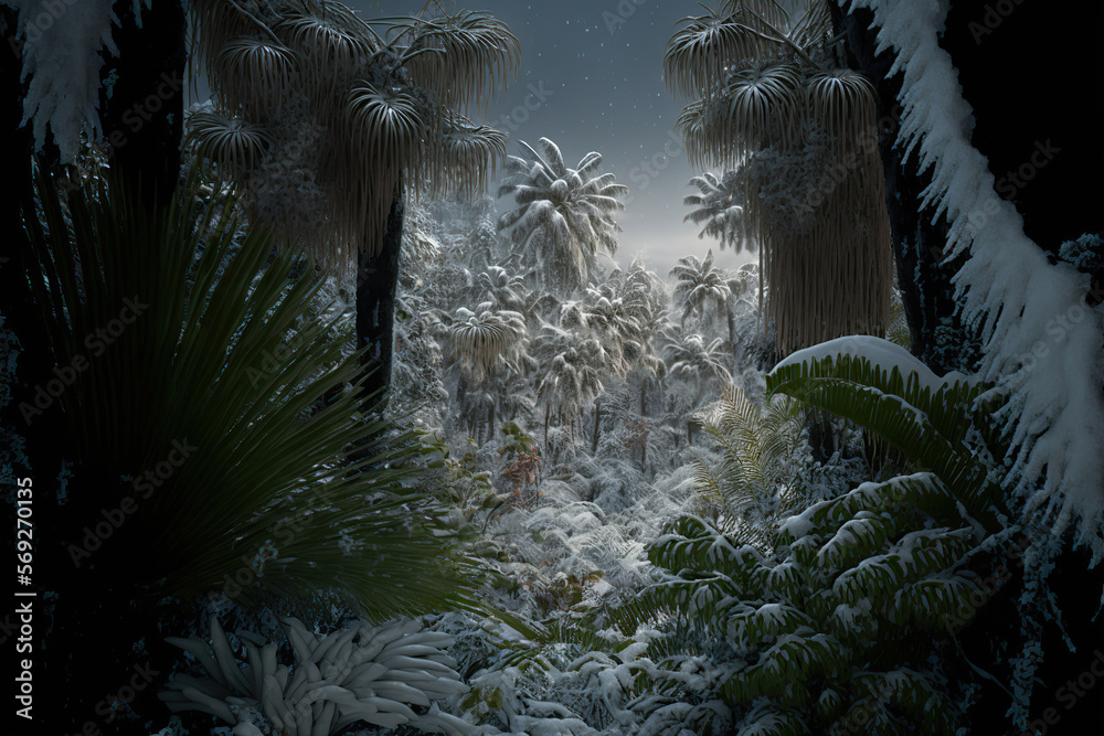 Illustration of frozen jungle or rainforest. Snow on tropical trees and plants. Climate change concept. AI generated image. #569270135