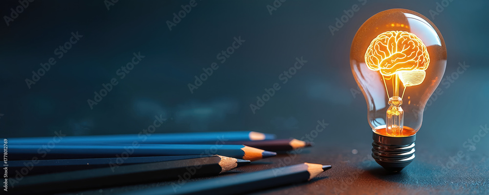 Illustration of glowing light bulb with brain symbol. Pencils beside. Study idea, education knowledge concept. Creative business concept. Learning brainstorming innovative ideas. Education tech, #1778012769