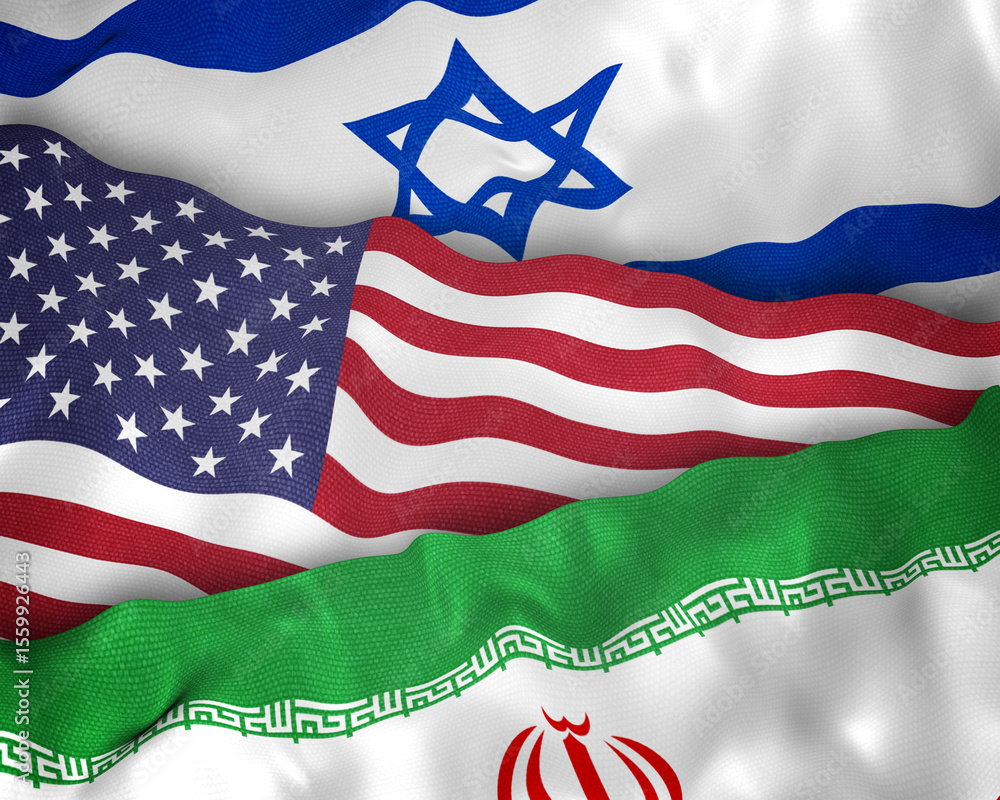 Illustration of Israel, USA, and Iran flags together, representing high-stakes diplomacy, regional conflict, and nuclear negotiations in the Middle East. #1559926443