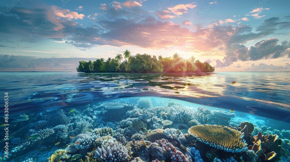 Illustration of Peaceful atoll with vibrant coral reefs and abundant marine life #863006534