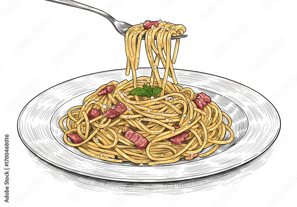 Illustration Of Spaghetti Carbonara On A Plate With A Fork In Isolated Black Background #1700468016