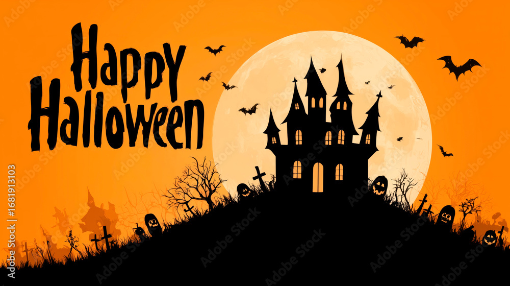 Ilustración de castillo encantado con luna llena y mensaje de Halloween #1681913103
