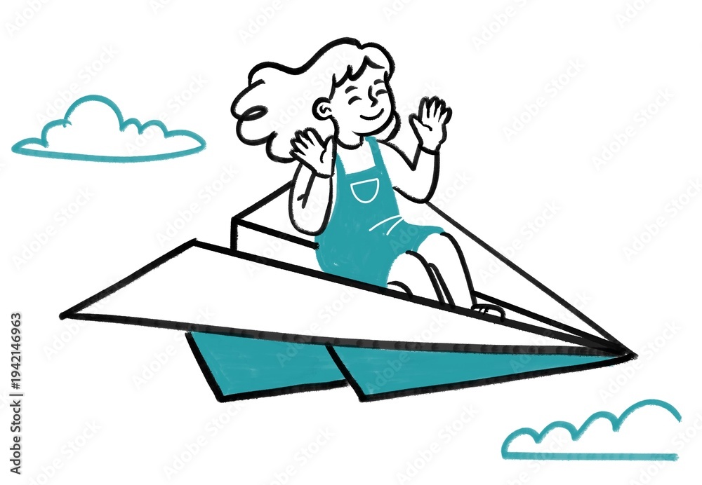 Ilustración de niña volando sobre un avion de papel #1942146963