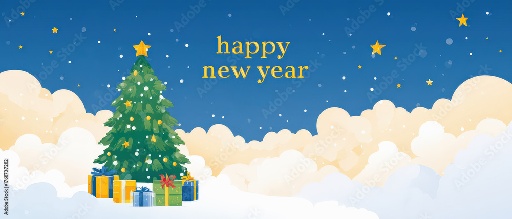 Ilustración festiva de Año Nuevo con un árbol de Navidad decorado, rodeado de regalos coloridos y un cielo azul de ensueño con nubes esponjosas como fondo. incripcion Happy new year #1768737282