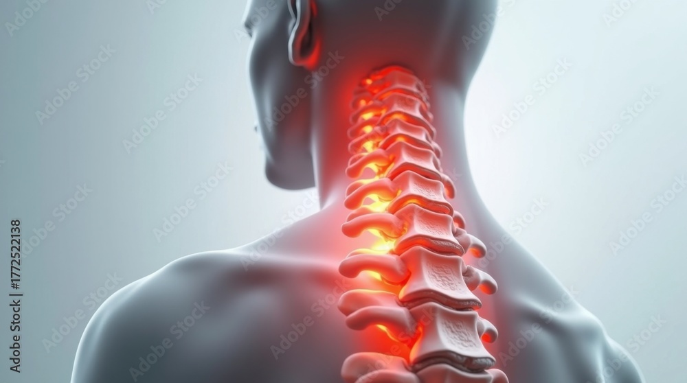 Ilustración médica en 3D de la anatomía de la columna vertebral humana con un resaltado rojo en las zonas de dolor y lesión #1772522138