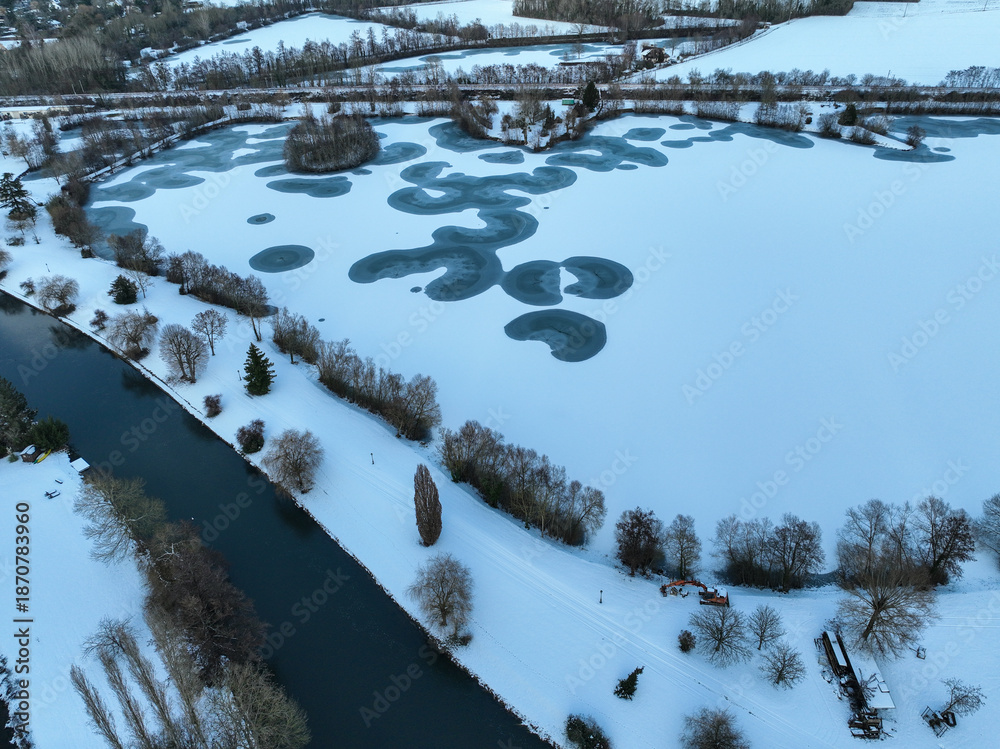 image aérienne prise avec un drone montrant un lac gelé et un paysage recouvert de neige durant l'hiver #1870783960