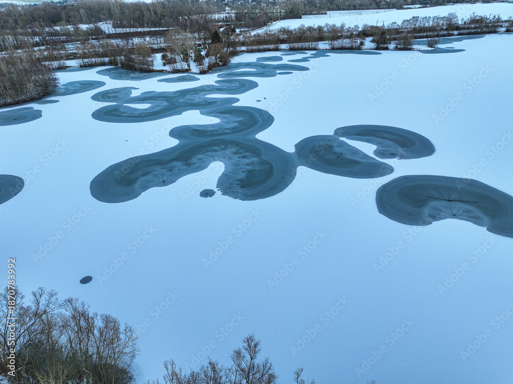 image aérienne prise avec un drone montrant un lac gelé et un paysage recouvert de neige durant l'hiver #1870783992
