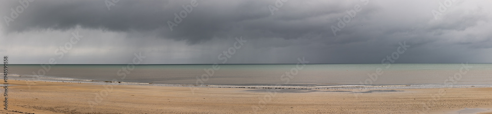 image panoramique montrant une plage déserte sous un orage en Normandie. #1948590558