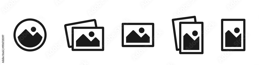 Image placeholder black icon set. Isolated flat blank album photo placeholder symbol on white background. Landscape picture frame concept gallery layout to upload. Vector illustration. #1936728397