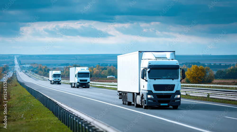 Image shows convoy of large trucks driving on highway through scenic landscape with trees and cloudy sky, suggesting long distance freight transport scene under partly cloudy weather #1524553663