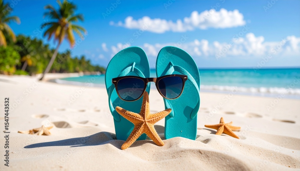 imagen vibrante y colorida con una temática veraniega y playera, sobre una arena fina y clara, se encuentra un par de chanclas de un llamativo color azul cian. #1547443532