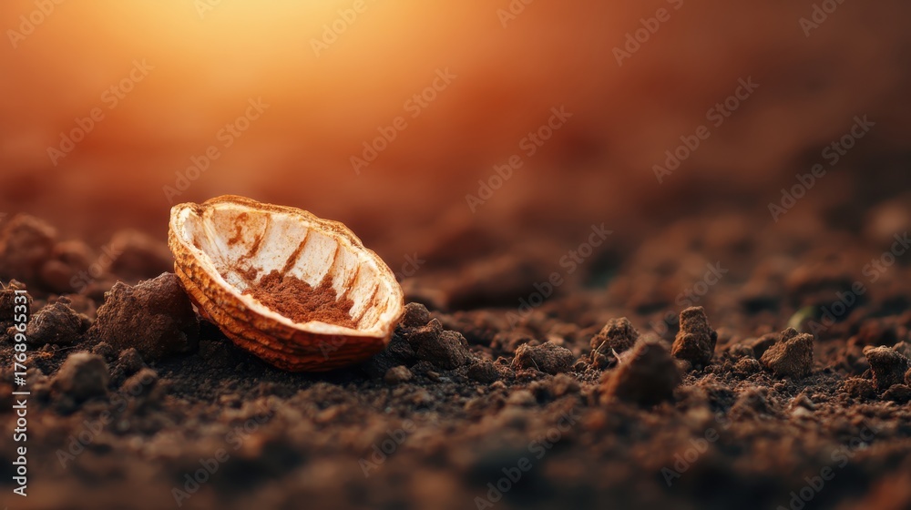 Impact of climate change on cocoa industry shown with an empty shell on dry cracked earth sad and powerful symbol #1768965331