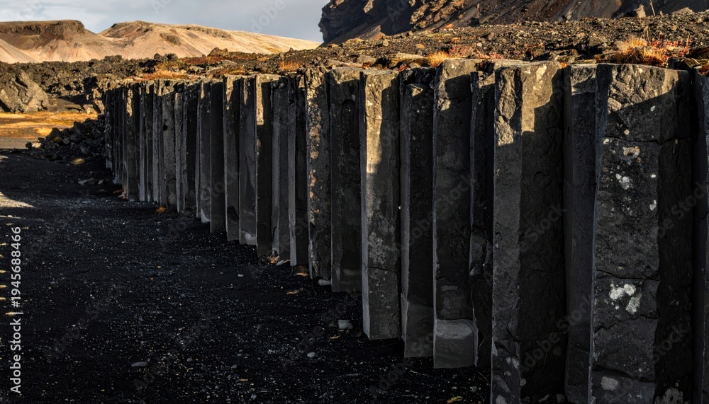 Imposing formation of dark basalt columns arranged in a rigid, geometric natural structure against a rocky landscape #1945688466
