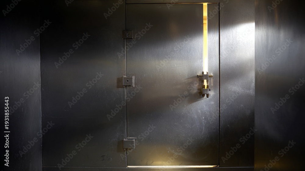impregnable. A massive steel vault door with a narrow slit of light escaping from the seam in a dark room. real-estate listings. #1931855443
