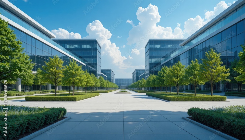 In a digital industry park, contemporary office buildings have sleek designs and glass windows. The broad concrete pathway is lined by green trees and shrubs. White clouds above a blue sky. symboli #1786965679