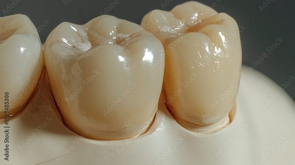 In a specialized dental lab, polished dental crowns gleam beautifully under soft lighting. The craftsmanship reflects precision and care, showcasing the artistry of dental restoration #1923485306