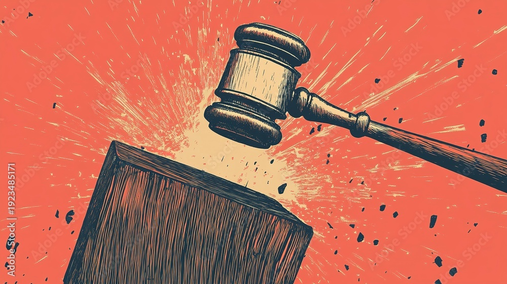 In a vibrant setting, a gavel falls sharply onto a wooden block, sending splinters flying. This moment captures the essence of justice being served with intensity and finality #1923485171